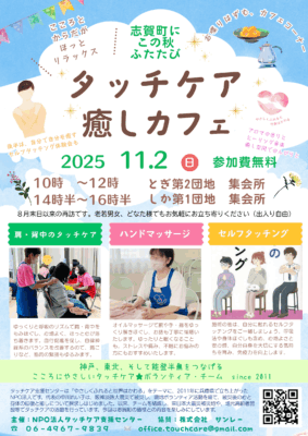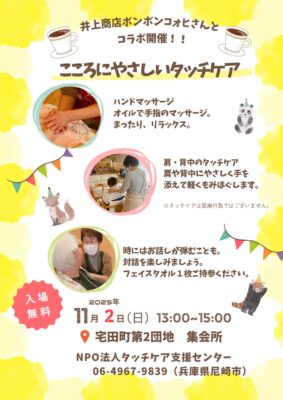 活動内容は”タッチケア癒しカフェ”と題して下記の内容です。