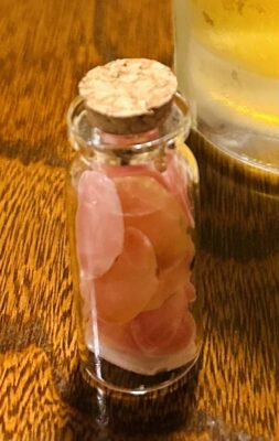 志賀の海岸でとれるピンク色の”さくら貝”の貝殻の入った小瓶です。