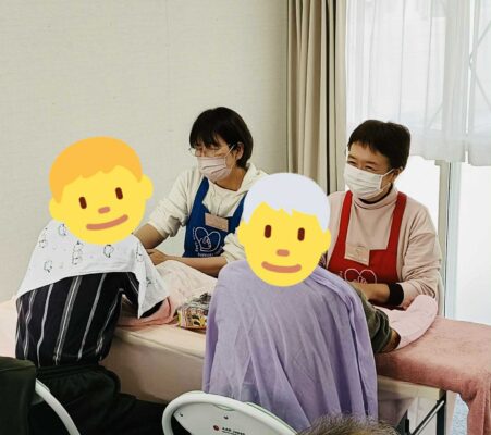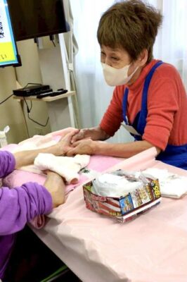 簡単なご挨拶と体調の聞き取りのあと、肩・背中へのタッチと軽いもみほぐし、後半はオイルを使ったハンドマッサージを行いました。背中がゆるむと、ほっとしてお話を始められる方が多く、「手と手が今ここでつながる安心感」を語ってくださる場面もありました。