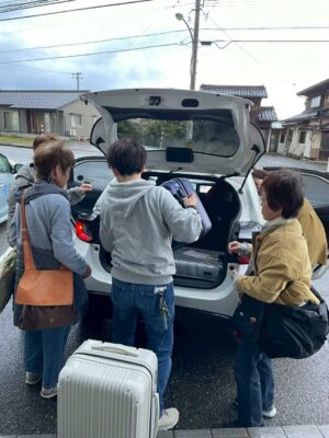 会場の石川県地場産業振興センターで午後1時30分に合流してから、車2台で金沢から羽咋郡志賀町へ。秋の能登半島は天候が不安定で、この日も雨の中のドライブとなり、安全運転でゆっくりと宿泊地である志賀町にすすみました。10月7日のセルフタッチング無料オンライン・WSで参加者の皆様の能登活動支援で投げ銭をいただき、レンタカー代金の一部とさせていただきました。ご協力心より御礼申し上げます。また運転を担当してくださった山根さん、安井さん、宮前さん、大迫さんにも感謝です。