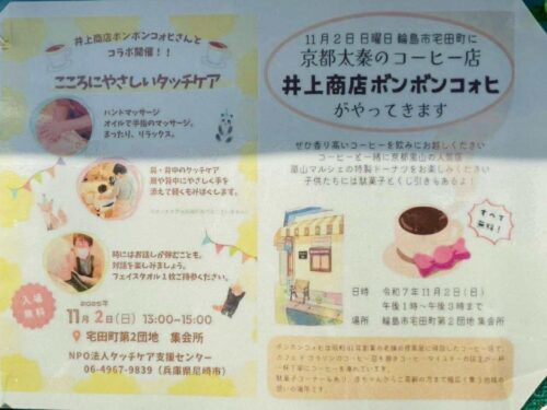 今回は、京都・太秦のコーヒー店「井上商店ボンボンコォヒ」さんとのコラボ開催でした。5月に七尾市・中島町第一団地の仮設でご一緒したご縁からお声掛けいただき、協働での実施となりました。タッチケア施術者は、上田晴子・安井理絵・宮前敬子の3名です。