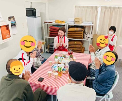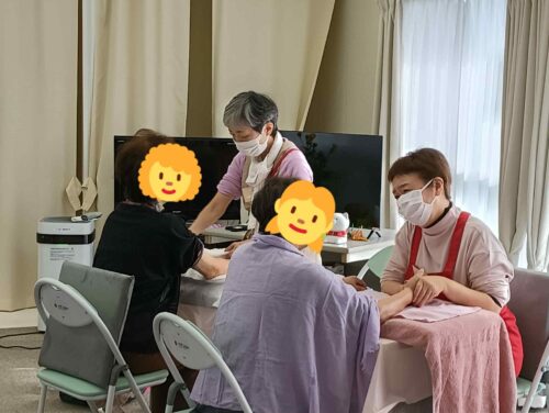 二度目の方もおられて、前回と同じ施術メンバーが担当し、再会をとても喜んでおられました。前回お会いした時よりも表情が明るくお元気なっておられるので驚きました。施術後も、お菓子のテーブルを囲んでの談笑は、笑顔と笑いが広がっていきました。今回は7名の方が施術を受けてくださいました。