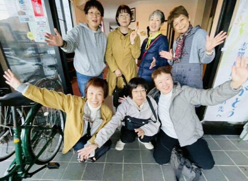(前列左から、宮前敬子・大迫節子・中川れい子、後列左から安井理恵・山根紀代美・桜井博子・上田晴子。すっかり常宿となった、志賀町のホテルやまぐちさんを出発する前に全員の記念写真)