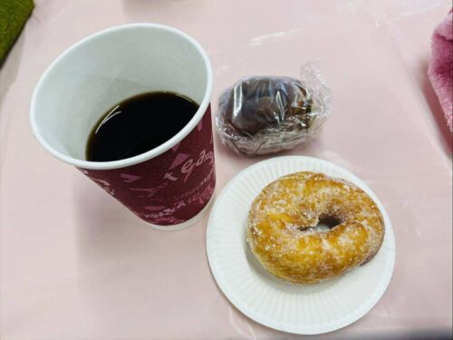 正午に集会所へ入り、井上商店さんと合流して準備開始。コーヒー&ドーナツのカフェコーナーとタッチケアスペースを整えました。13時の開場を待つ間に突然の雷雨があり心配しましたが、悪天候の中でも多くの方が来てくださいました。