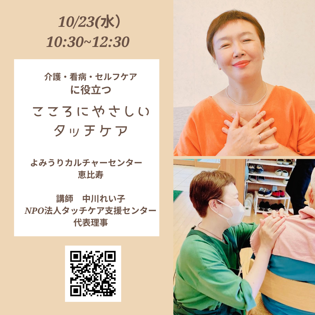 10月23日、東京『介護・看病・セルフケアに役立つ~ 家族でふれあう“こころにやさしいタッチケア”よみうりカルチャーセンター恵比寿』